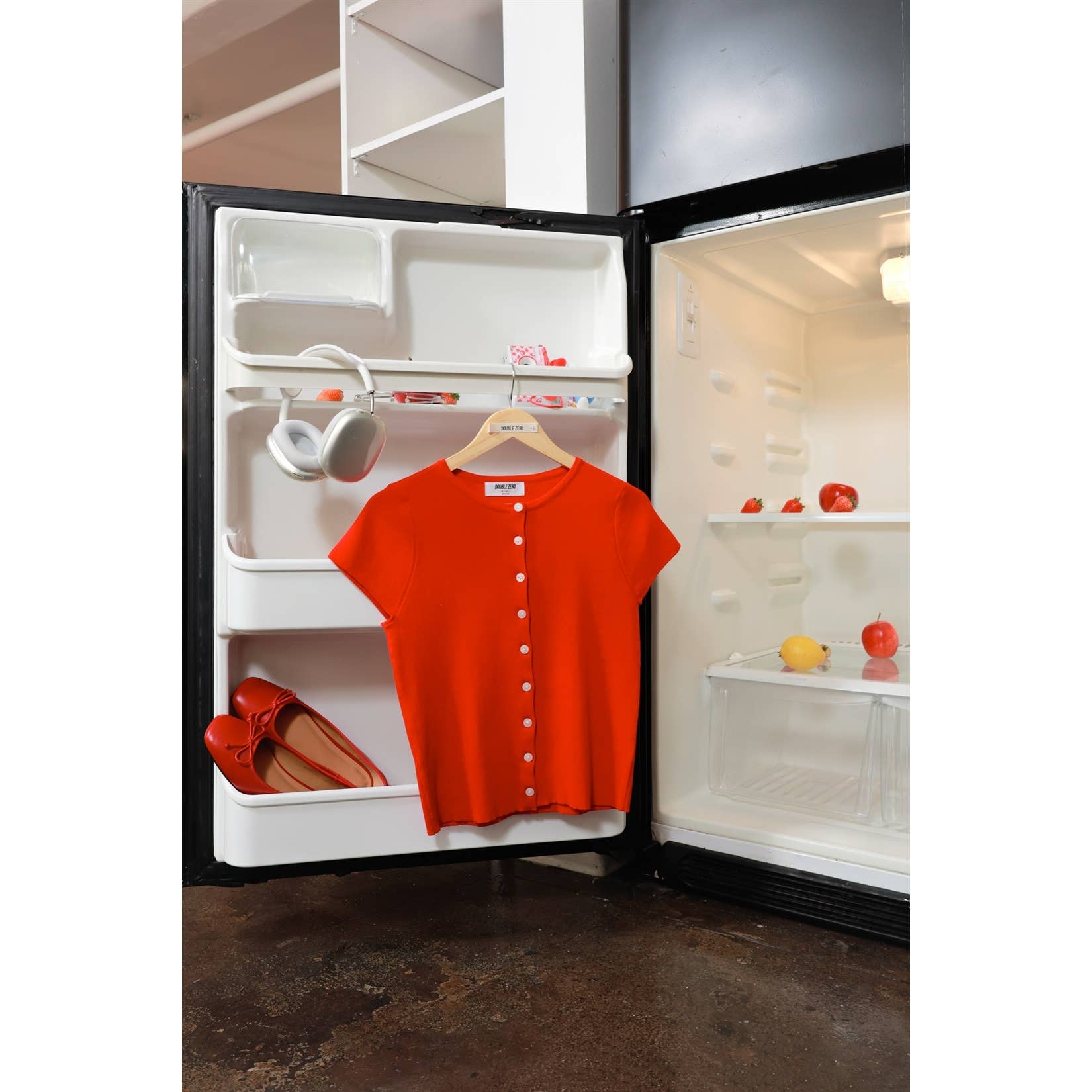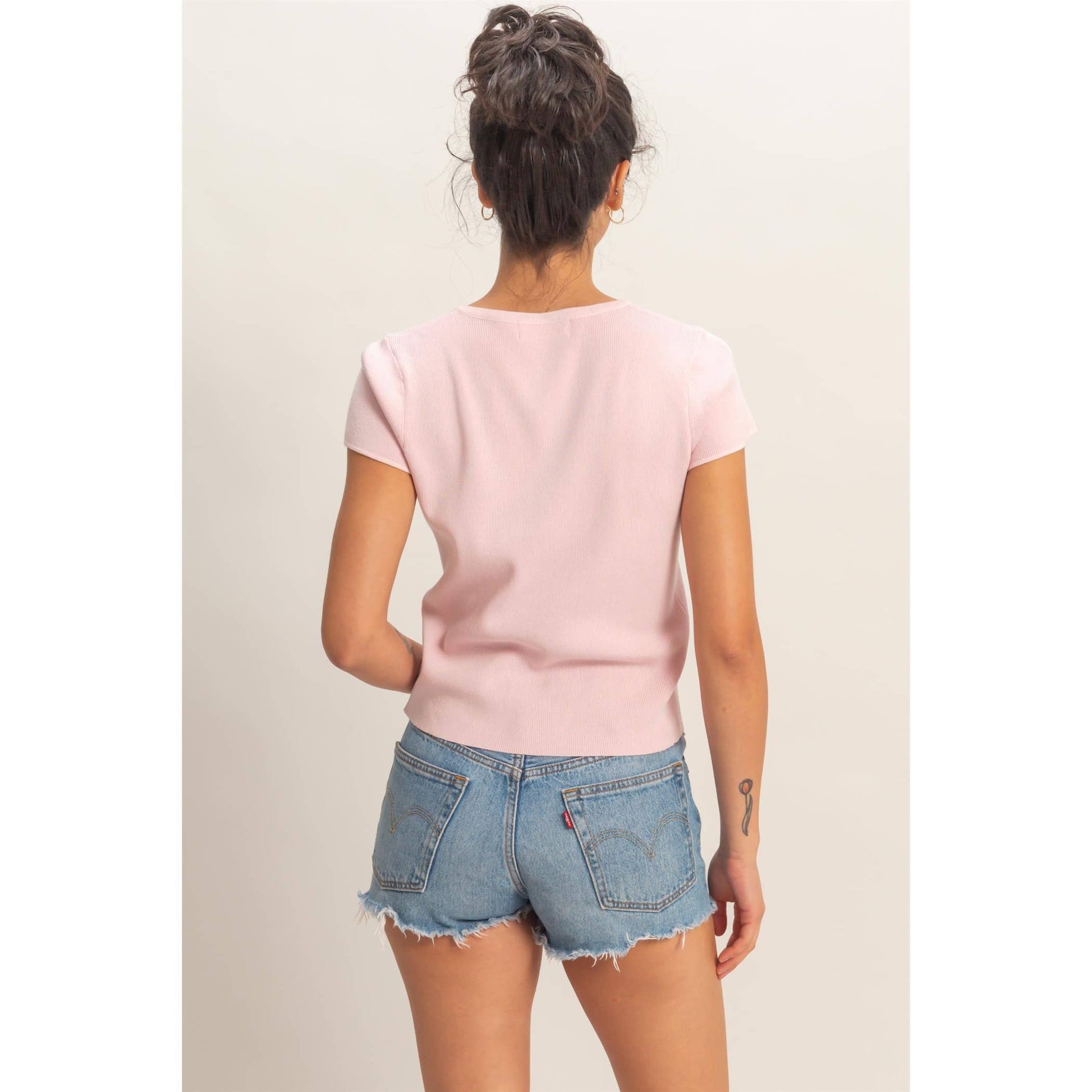 This top is crafted from stretched knit and features a classic round neckline, tailored short sleeves and a full front button placket. Cut in a true-to-size fitted silhouette, this top can be styled with high-waisted jeans and sleek sneakers for a relaxed look.